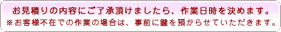 ※ 振り込みや後日集金は受け付けておりません。※ お客様ご不在で作業をする場合は前払い制とさせて頂きます。※ お客様の鍵をお預かりしている場合は、指定場所に置くか、もしくは後日郵送、または直接返却させて頂きます。 お見積りは無料!お気軽にどうぞ。